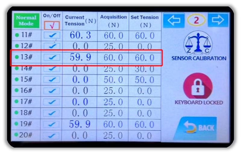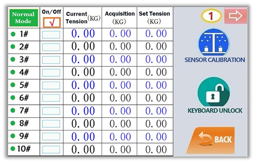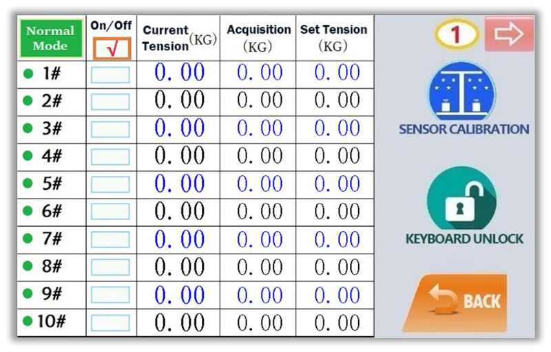 A nossa Urideira apresenta um sistema de controle complexo com uma interface fácil de usar. Há quatro páginas navegáveis nessa interface, cada uma mostrando dez posições de feixe de urdidura para quarenta posições de feixe de urdidura no total.